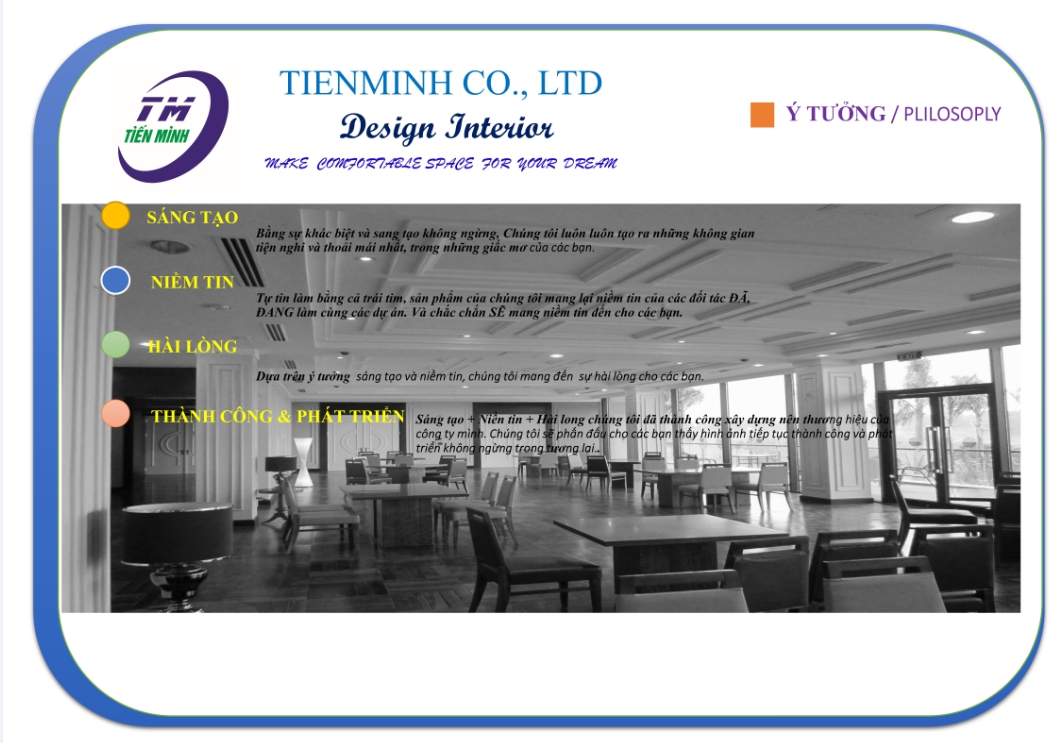 - Thiết kế, tư vấn thi công nội thất, không gian văn phòng, nhà xưởng, khu phức hợp thương mại, nhà hàng, khách sạn, trung tâm văn hóa, triển lãm, tín dụng, thể thao ....