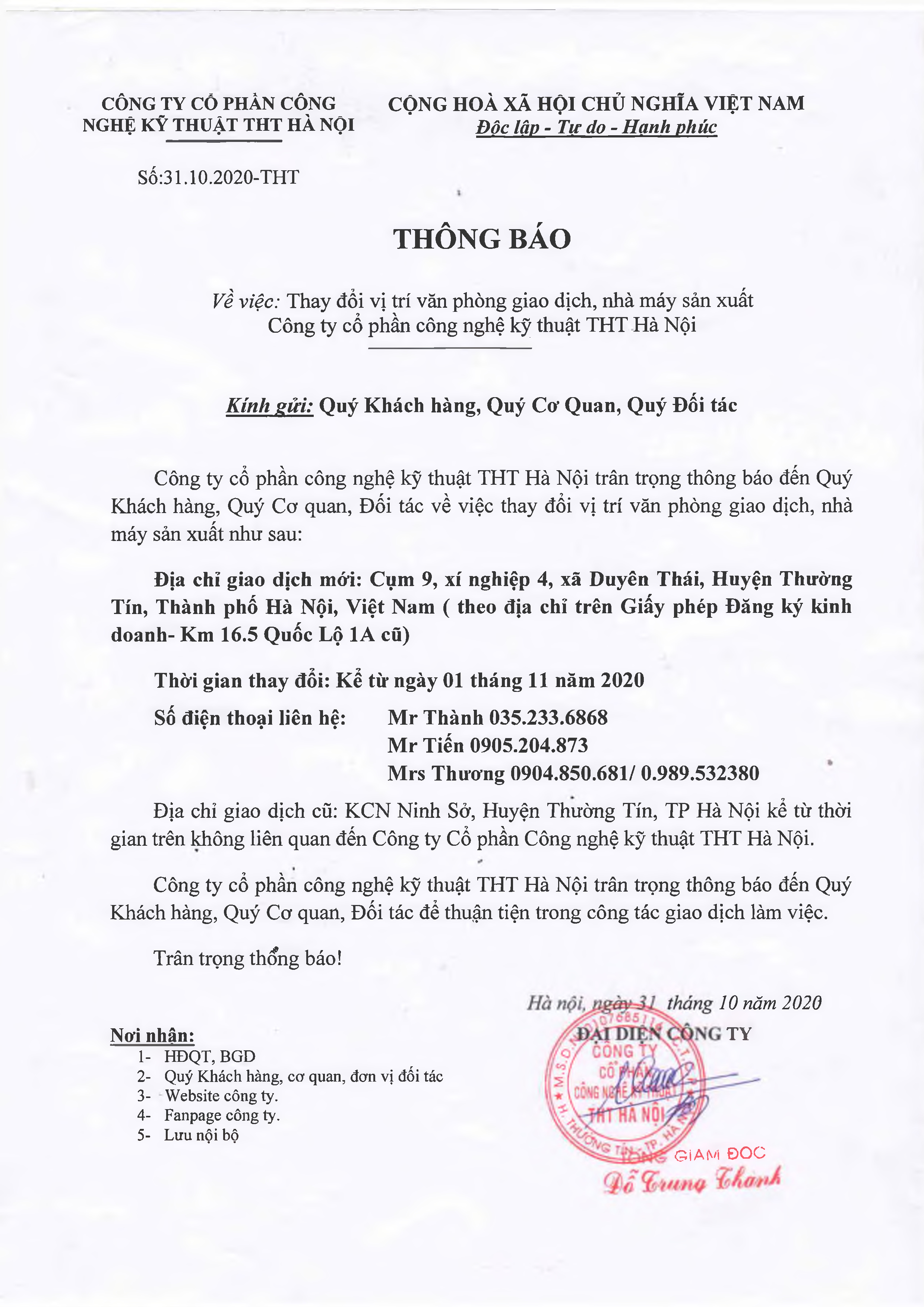 THÔNG BÁO THAY ĐỔI ĐỊA CHỈ NHÀ MÁY